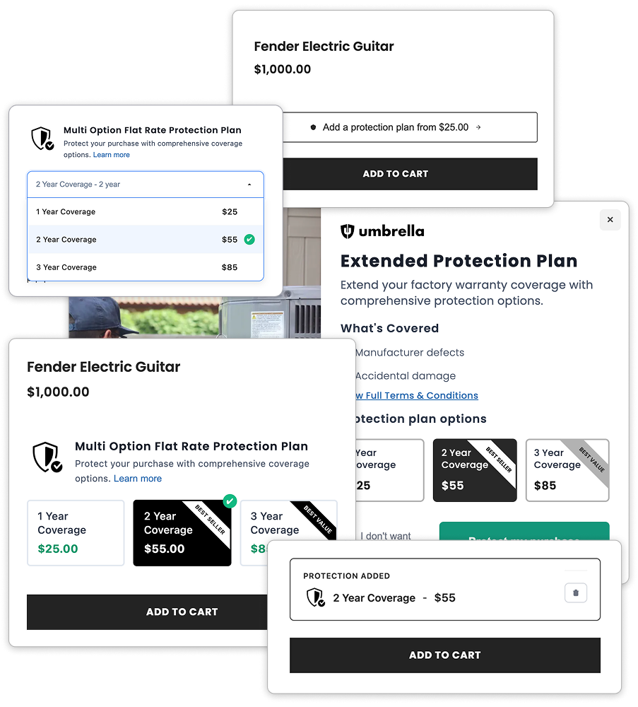 Cover accidental damage, loss, theft, and other incidents with paid protection plan add-ons for your products
